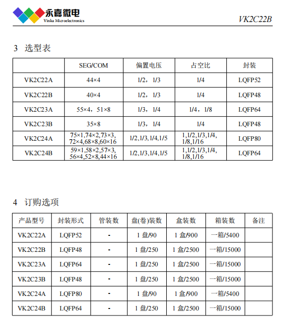VK2C22A??2.4~5.5V 44seg*4com? ?? 偏置電壓1/2 1/3? I2C通訊接口? LQFP52;DICE/DIE裸片(綁定COB);COG(綁定玻璃) 高抗干擾/抗噪/低功耗